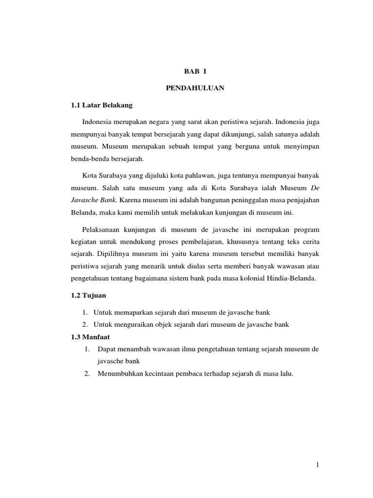 Makalah ini dibuat dalam rangka memperdalam pemahaman dan pengetahuan tentang segala hal yang berkaitan dengan museum dimana hal tersebut sangat diperlukan untuk memeperluas pengetahuan mahasiswa tentang sejarah bank indoneisa khususnya dengan suatu harapan lainya dimana makalah ini bisa lebih bermanfaat untuk mahasiswa dan bahkan umum. Pintu besar utara jakarta dan menempati area gedung bank indonesia kota depan stasiun bus kota. Museum bank indonesia sendiri diresmikan oleh.