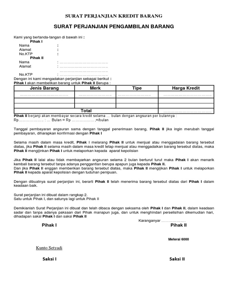 Surat perjanjian kredit barang. Contoh surat perjanjian kredit barang. Demikian surat perjanjian ini dibuat atas kesepakatan bersama dari kedua belah pihak dalam keadaan sadar dan sehat baik secara jasmani maupun rohani dan juga tanpa paksaan dari pihak manapun.