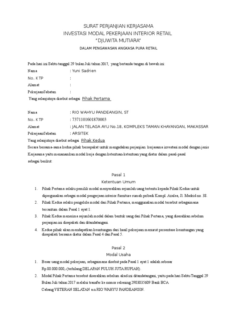 Surat perjanjian investasi modal usaha. Pihak kedua dengan ini berjanji dan mengikatkan diri untuk melaksanakan perputaran dana investasi pada usaha peningkatan modal investasi online setelah ditandatanganinya perjanjian ini. 71 24 71 menganggap dokumen ini bermanfaat 24 suara 35k tayangan 5 halaman. Surat perjanjian sendiri mencakup banyak hal salah satunya adalah tentang perjanjian kerjasama usaha.