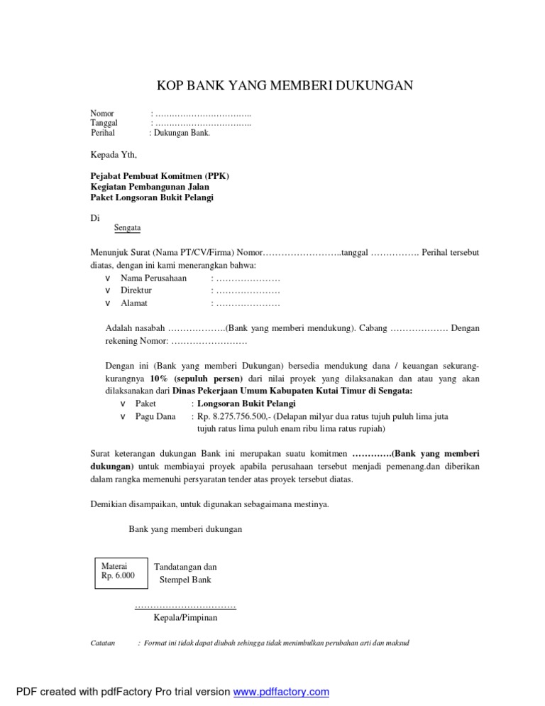 Untuk memperbesar peluang memenangkan tender tersebut para anggota tender bisa mempergunakan surat dukungan sebagai rekomendasi penguat kelayakan untuk melaksanakan tender tersebut. Surat dukungan bank bukan merupakan komitmen yang mengikat bagi bank untuk merealisasikannya mengingat realisasi dukungan tersebut sepenuhnya didasarkan pada. Surat dukungan ini diberikan untuk mengikuti pelelangan paket pekerjaan normalisasi sungai kabaena timur dan batalberakhir dengan sendirinya apabila asli dari surat dukungan ini dikembalikan ke bpd sultra.