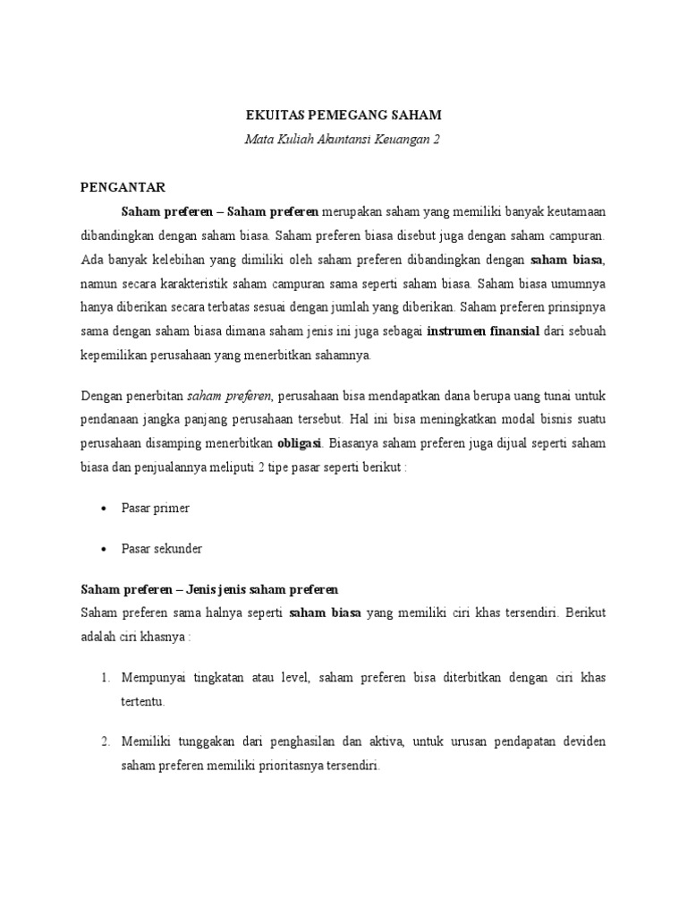 Contoh soal dan jawaban saham preferen dan saham biasa. Berikut ini adalah contoh dari saham preferen. Saham preferen preferred stocksaham preferen adalah suatu surat berharaga yang dijual oleh suatu perusahaan dengan menunjukan nilai nominal rupiah dolar yen dan sebagainya yang dapat memberi pengembangannya berupa pendapatan yang tetap dalam bentuk deviden yang akan diterima setiap kuartal tiga bulan. Perusahaan menjual 1 paket saham yang terdiri dari saham biasa 1000 lbr at 10 dan saham preferen 1000 lbr at 10.