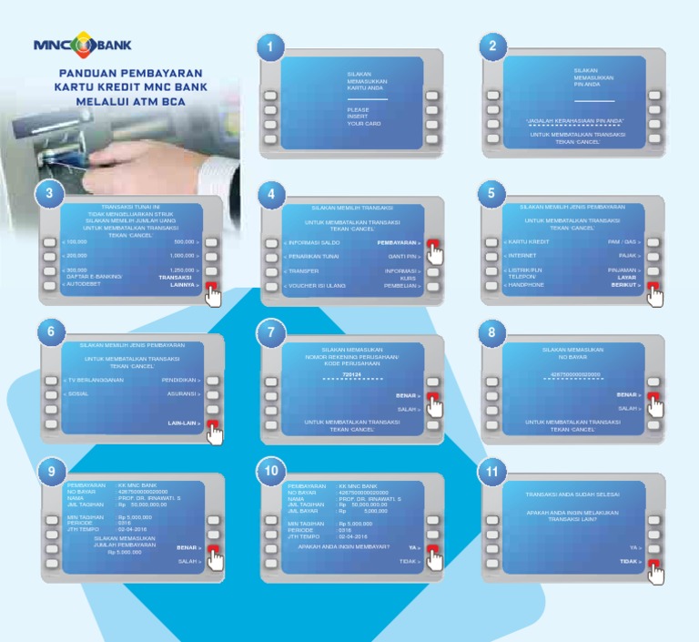 Cara membayar tagihan kartu kredit mnc bank dengan mudah dari atm bca meskipun pada menu atm belum terdapat pilihan untuk melakukan pembayaran kartu kredit mnc. Mnc bank akan. Berikut ini adalah cara melakukan pembayaran kartu kredit mnc di atm bca.