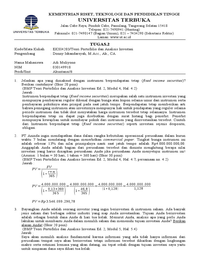 Soal Ujian Ut Akuntansi Eksi4203 Teori Portofolio Dan