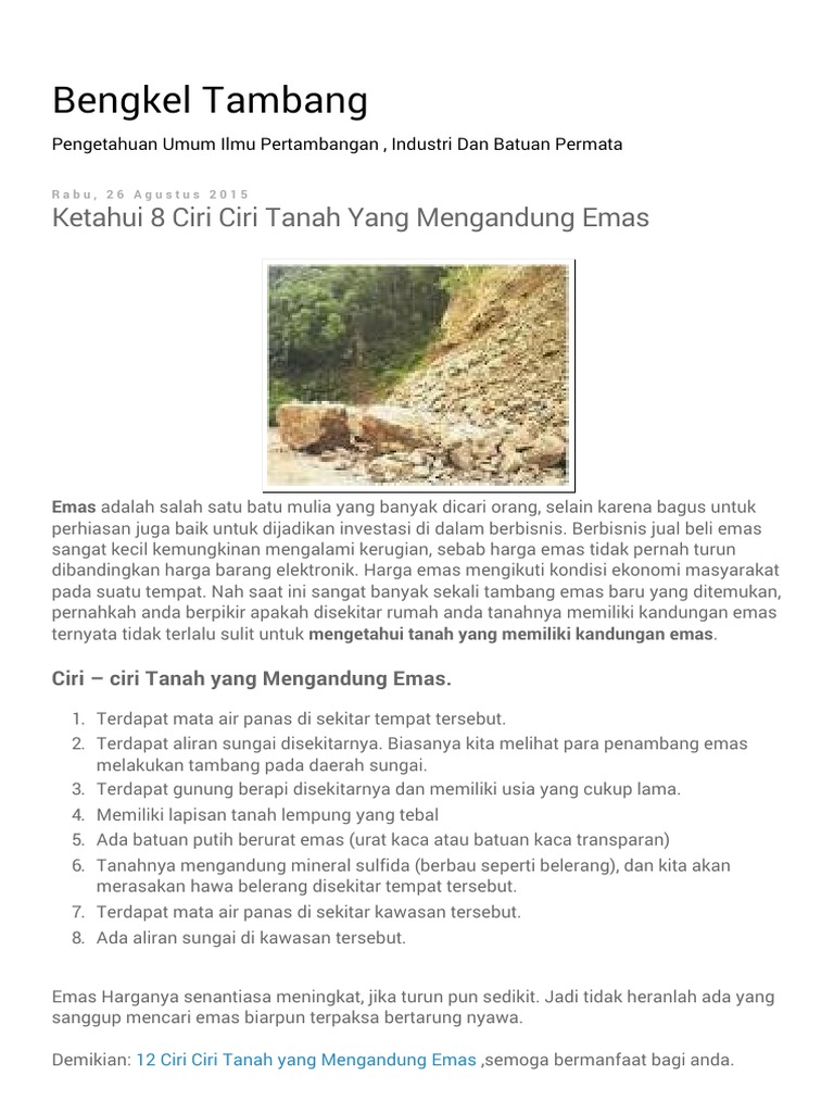 Tanah yang mengandung emas tanah yang mengandung emas sebuah bongkahan emas ataupun berlian tidak mungkin dong tiba tiba ada didepan jalan lapangan atau tempat populer lainnya. Biasanya kita melihat para penambang emas melakukan tambang pada daerah sungai bukan. Ciri ciri tanah yang mengandung emas.